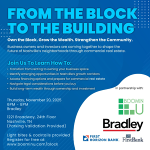 Nashville is growing fast, and the communities that built its culture deserve a seat at the table of progress. From the Block to the Building is a powerful, action-oriented conversation on how minority business owners and investors can build wealth, stability, and community impact through commercial real estate ownership.